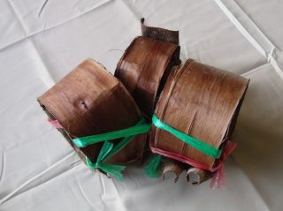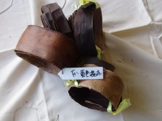 | 鬼クルミの樹皮採取状態のままのものです。樹皮の表面、裏面とも肌がきれいで厚さはやや薄く均一で節穴少なく良質なひごが採れます。細い枝からの採取が多く柔らかで作業性も優れています。くるみ皮としては特に良品質な皮です。 |