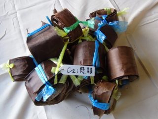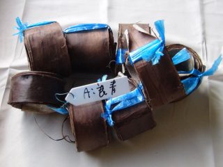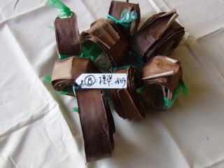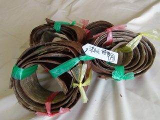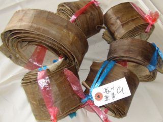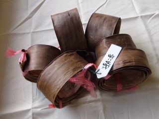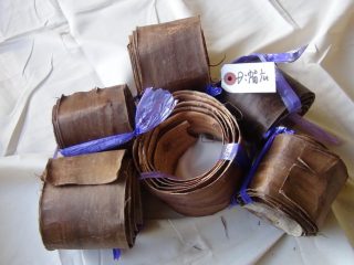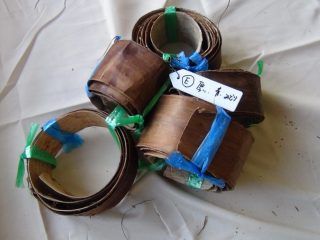 樹皮の採取には長さを注意深く短いものは採取しないようにしていますがいろいろな事情にて短いものが混じってしまうのです。樹皮の長さは1m未満となります。幅や厚みは混在します |