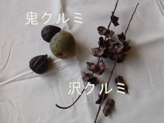 クルミの篭材料のクルミ樹皮には一般に見るクルミの実を付ける「鬼クルミ」とこれが「・・クルミ・・?」と思わせる 奥山に生息する「沢クルミ」、あれ何か変なクルミだぞ・・と思わせる「野クルミ」があります。鬼クルミは里地の河川敷などに多数あって普通に採取ができます。樹皮は 梨地模様で節が少なくクルミ篭編みとしては適しているようです、一方の沢クルミは生息地が高地で冷涼な所を 好むことから余り一般的な樹木ではありません、採取地が限定されていることから採取も少ないクルミの樹皮となります。 奥山では鬼クルミと違い大木となった沢クルミの木を見ることが多くその周辺には小さな幼木も見ることが出来ます。 沢クルミは枝が交互に出ることから樹皮は節穴が多くなり綺麗なものはほとんど採取が出来ません。野クルミは実がついてない鬼クルミのようです。このクルミの皮も 篭にすると一味違った雰囲気を醸し出す優雅な篭に変身します。