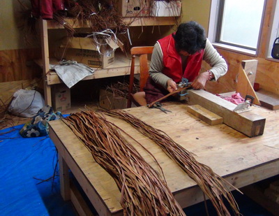 自社採取、加工 希(めぐみ)工房では山葡萄の樹皮の採取からひご作り、篭編み、アフターメンテナンスまで一貫して行っています。 専任のスタッフが「ひご」をつくっています。ひご作りは裏方作業ですがこのひご作りが山葡萄篭編みでは品質に 大きな比重を占めて大変重要な役割です。 |